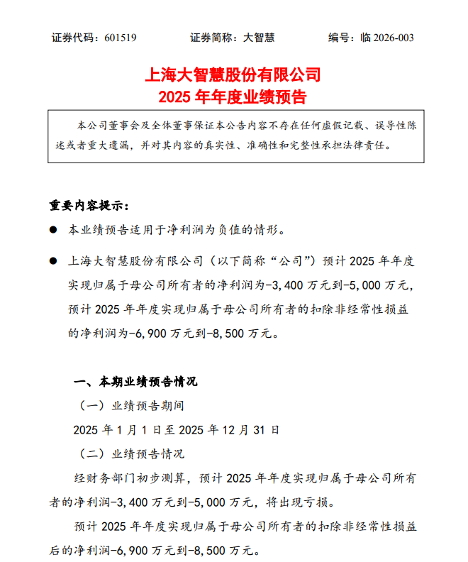1月16日,大智慧(601519.SH)发布2025年度业绩预告,预计归属于母公司所有者的净亏损3400万元~5000万元。上年同期净亏损2.01亿元。本期较上年同期部分业务收入有所增长,公司持续推进降本增效,成本费用减少较大,但收入的增长尚不足以覆盖成本。